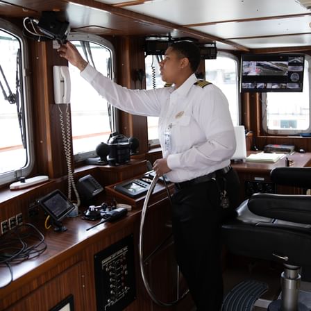 All of our vessels are regulated, licensed and inspected by the United States Coast Guard (USCG) every year, and have undergone stability testing to ensure our guests are safe on their waterway experience. Our captains and deckhands go through an extensive training and drilling program that goes above and beyond the standards set by the USCG. Because we are committed to continuing education, we provide extra training every day to our crew.